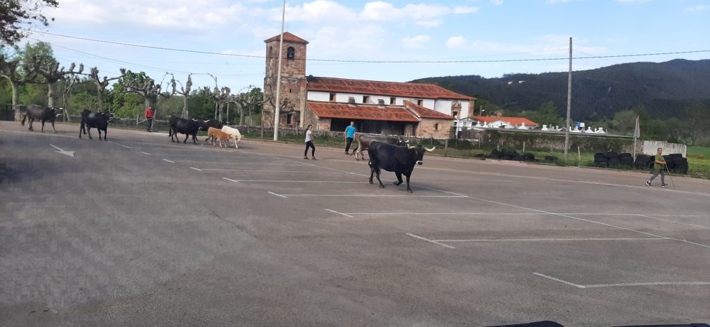 Die Nacht auf P 3 war relativ ruhig. Naja, schon ruhig mal von einer verirrten Kuh abgesehen. Gegen 18.00 Uhr wurden Kühe über den Platz getrieben. Waren wir ja schon seit Puente Viesgo daran gewöhnt. Gegen 19.00 Uhr kam dann eine einzelne Kuh auf den Parkplatz und schlenderte gemütlich umher. Sie war wohl beim Viehtrieb irgendwie abhandengekommen. Auf jeden Fall blieb sie die Nacht bei den rund 10 WOMOs auf dem riesigen Platz. Sie war ja ruhig, nur hatte sie eben eine große Glocke um den Hals. Du verstehst was ich meine? Aber das ist ja nicht wirklich eine Störung des Schlafes, im Gegenteil.