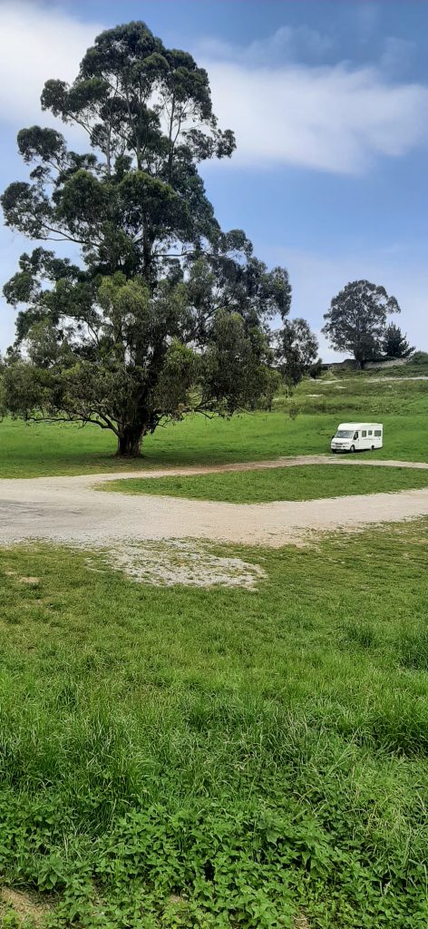 10 Gehminuten vom Hafen standen wir auch in der zweiten Nacht mit nur 7 weiteren WOMOs im Schutz des mächtigen Eukalyptusbaumes. Der Platz würde locker für 30 oder mehr WOMOs ausreichend Stellplätze bieten. Aber so ruhig ist es uns ja lieber.