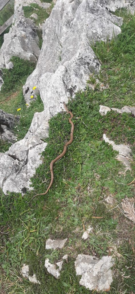 Plötzlich wurde Sybille unruhig. Sie hatte etwas gesehen das Raphael schon lange erspäht hatte aber aus gutem Grund nicht erwähnt. Circa 5 Meter entfernt lag an einem Felsen in der Sonne ein Stück abgerissenes Seil. Doch als es sich bewegte war klar, es war etwas gänzlich anderes! Eine Kreuzotter! Raphael ging näher hin und fotografierte die Schlange. Sybille, die vor ein oder zwei Jahren den Mirador sofort verlassen hätte, wagte es und ging bis auf einen halben Meter an die Schlange heran. Als sie das erzählten war ich echt stolz auf das Mädchen. Auch sie hat sich ein Chapeau verdient.